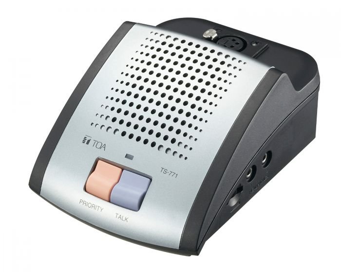 The TS-771 is a Chairman unit for TOA Conference system, of which compact and lightweight design makes it easy to install and store. Placing the speech button in the ON position allows a chairman to speak and disables the speaker to prevent feedback. If the speech button is placed in the OFF position, the microphone cannot be used but the speaker is turned on, allowing the voices from delegate units (TS-772) to be monitored. By pressing the priority button, the chairman unit can take precedence over any delegate units. Two types of dedicated microphones are made available for the TS-771 as optional products: the TS-773 standard type and the TS-774 long type.